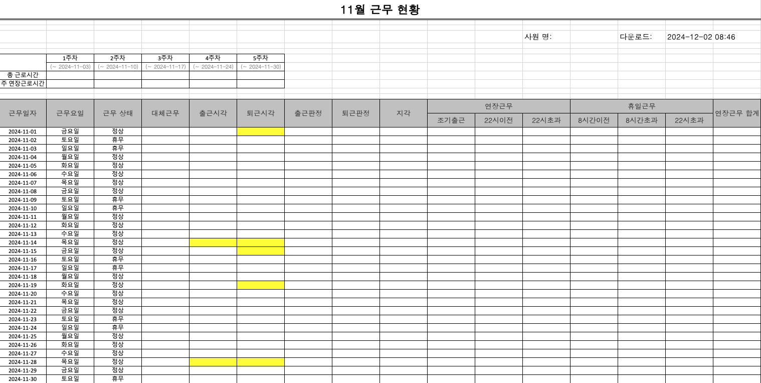 노란색 cell의 경우 출퇴근시각이 찍혀있지 않으면 노란색으로 표기했습니다!